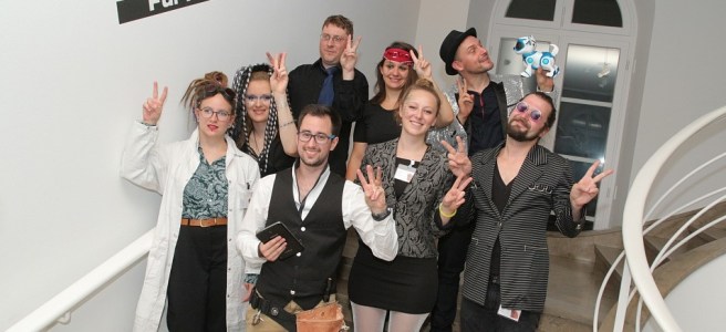 Nach der langen Vorbereitungsphase waren wir sehr gespannt, als wir am Freitagabend, dem 6. Juli, in unseren thematisch abgestimmten Kostümen die ersten Gäste im Filmraum begrüßten. Der Abend begann mit gedimmtem Licht und erwartungsvoller Laune. Jörg Hartmann führte als glamouröser Moderator in die Geschichte der Lesenacht ein. Nach einem kurzen Vorfilm zur Einstimmung auf das dystopische Szenario von 2084 durften die Zuhörer den Ausstellungsraum betreten. Mit futuristischen Headsets bewaffnet, schlüpften wir in unsere Figurenrollen. Statt sitzend nur einem Vortragenden, wie bei einer Wasserglaslesung, zuzuhören, bewegten sich die Kulturfans durch das eindrucksvolle Trümmerfeld der Revolutionsausstellung und lauschten den imaginären Wegen unserer Figuren. Ein passendes Ambiente für die Texte – das fanden auch die Zuhörer. So manches Schmunzeln konnte man auf den Gesichtern erkennen, wenn die Verbindungen zu den anderen Figuren ganz nebenbei klarer wurden.