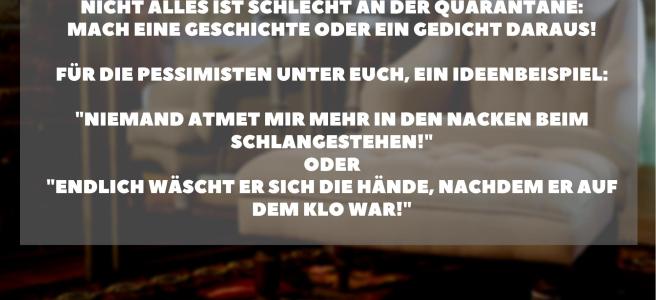 Wir wollen euch in den nächsten Wochen die Langeweile mit ein paar Schreibimpulsen vertreiben! Ihr dürft natürlich gerne eure Geschichten hier in die Kommentare posten oder uns schicken ![]()