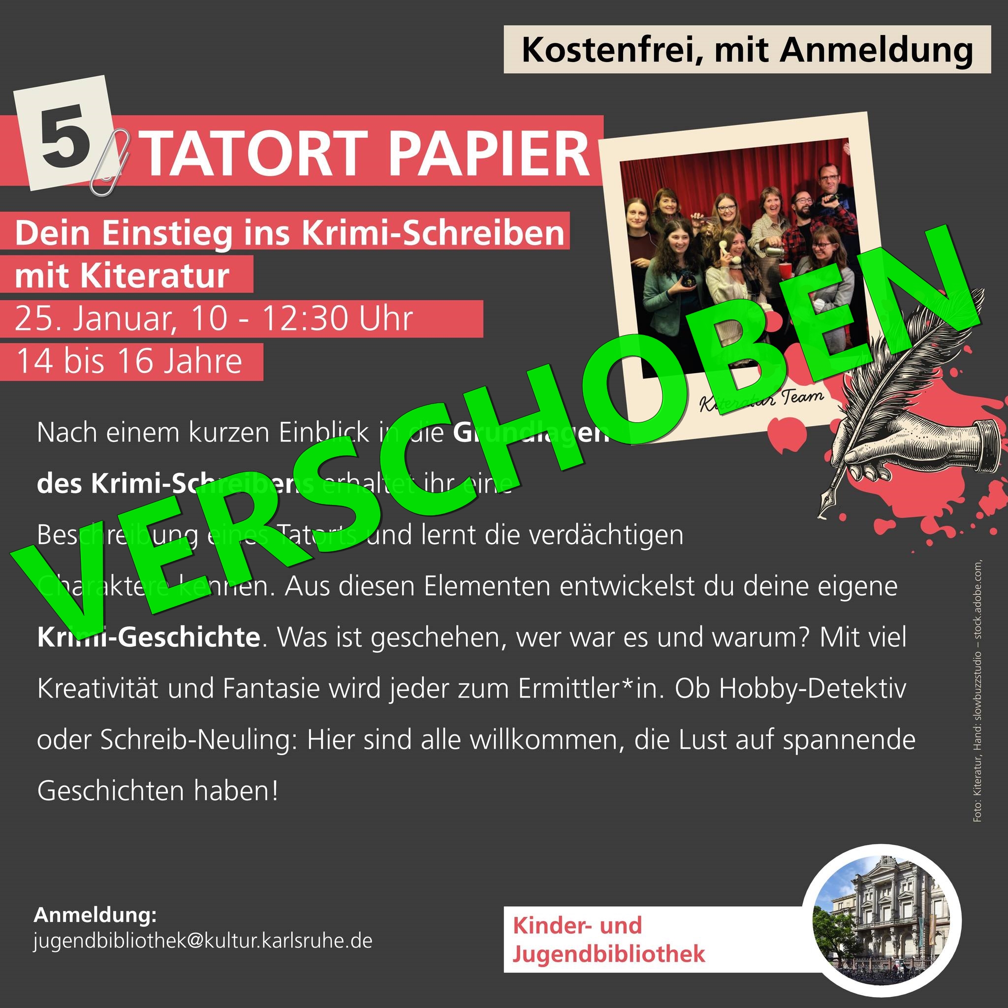 Leider müssen wir unseren Workshop „Tatort Papier“ am Samstag in der Kinder- und Jugendbibliothek verschieben. Doch aufgeschoben ist nicht aufgehoben! Wir melden uns bald mit einem neuen Termin bei euch 🕵️♂️
